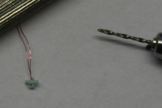 Von unten wird dann die SMD-LED eingefuehrt und durch das seitliche Loch soll das Licht austreten. Zum Groessenvergleich der Bohrer, den man hier noch sieht, hat 1,2mm Durchmesser.