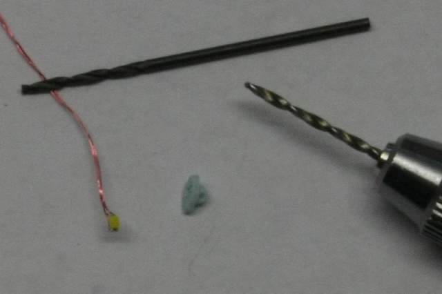 Verwendet habe ich die Startnummernbeleuchtung von einem Fujimi Ford GT40. Dies ist das blaue Knuppelchen in der Mitte des Bildes. In diesem sieht man schon die Loecher, welche ich gebohrt habe. Erst ein 1,2mm grosses Loch von unten und dann ein 0,9mm grosses Loch von der Seite.